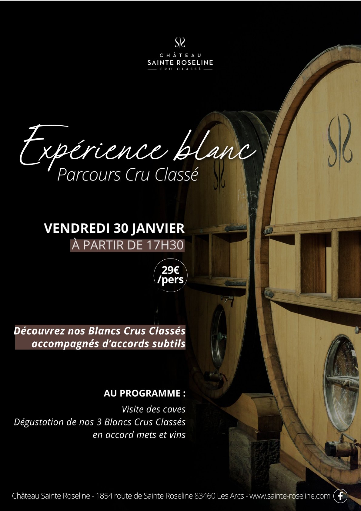 La dégustation inclut des accords à base de fromages et de produits d’épicerie fine (tartinades). En cas d’allergie ou d’intolérance alimentaire, merci de nous en informer au moment de la réservation à l’adresse mail : m.fleury@sainte-roseline.com